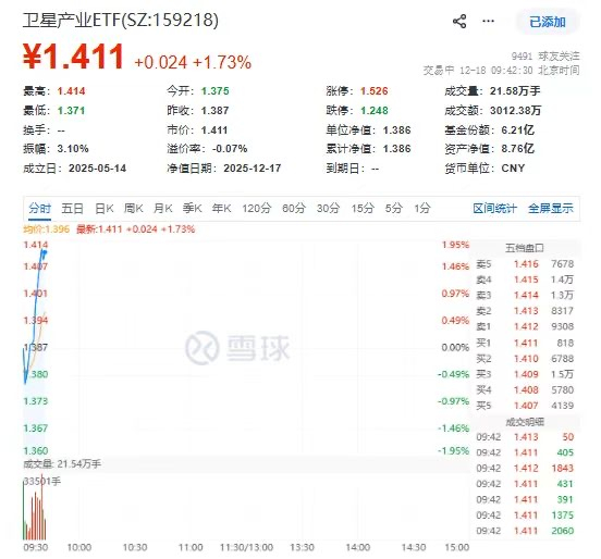 12月18日,卫星产业王者归来!截至9时40分,首支卫星产业ETF(159218)放量涨1.7%,成分股奥普光电涨停、臻镭科技、长江通信、振芯科技涨幅居前;交投持续升温,换手率达2.56%,成交额超2200万领跑同类。