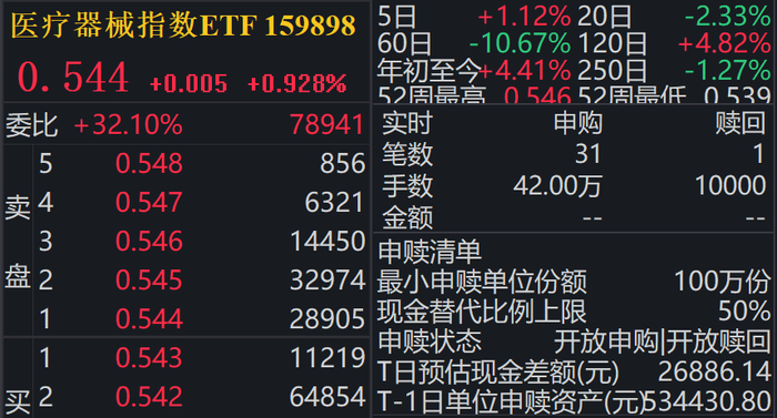 12月18日临近收盘,医药多个细分板块表现强势。其中,百分百表征A股医疗器械板块的医疗器械指数ETF(159898)盘中上涨0.93%;按照资金实时流入数据和净值计算,该ETF今日盘中已获得超2200万资金净买入。