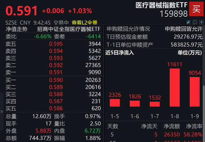 近日开盘该ETF高开涨超1%,成份股迪安诊断强势涨停,英诺特大涨超10%,金域医学、翔宇医疗、可孚医疗、祥生医疗等多股涨超4%,权重股迈瑞医疗、联影医疗分别涨1.56%、2.73%,福瑞医科、鱼跃医疗等跟涨。
