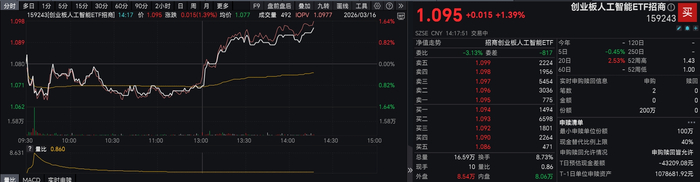 3月16日午后,A股AI算力、光通信板块异动走强,创业板人工智能ETF招商(159243)盘中震荡上行,场内价格翻红拉升涨1.39%,资金交投趋于活跃。成份股涨跌互现,北京君正涨超8%,星辰科技、富瀚微涨超7%,新易盛、中际旭创、联特科技等多股领涨,天孚通信、东土科技、锐捷网络领跌。