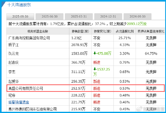 最令人费解的是,高盛公司有限责任公司作为新面孔,出现在了前十大流通股东名单中。