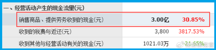 然而,财报下一页的现金流量表,却讲述了一个完全不同的故事。公司销售商品收到的现金达3亿元,同比大增30.85%。