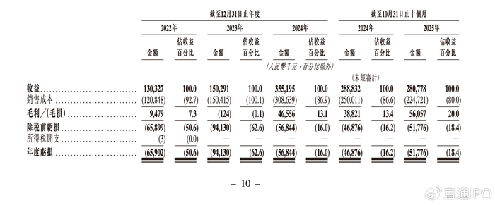 2022-2024年及2025年前十个月,傅里叶半导体的收益分别约1.30亿、1.50亿、3.55亿、2.81亿元;毛利分别为947.9万、-12.4万、4655.6万、5605.7万元,毛利率分别为7.3%、-0.1%、13.1%、20.0%;年度亏损分别为6590.2万、9413.0万、5684.4万、5177.6万元,经调整亏损分别为5807.8万、8628.7万、4900.1万、4569.7万(约)元。
