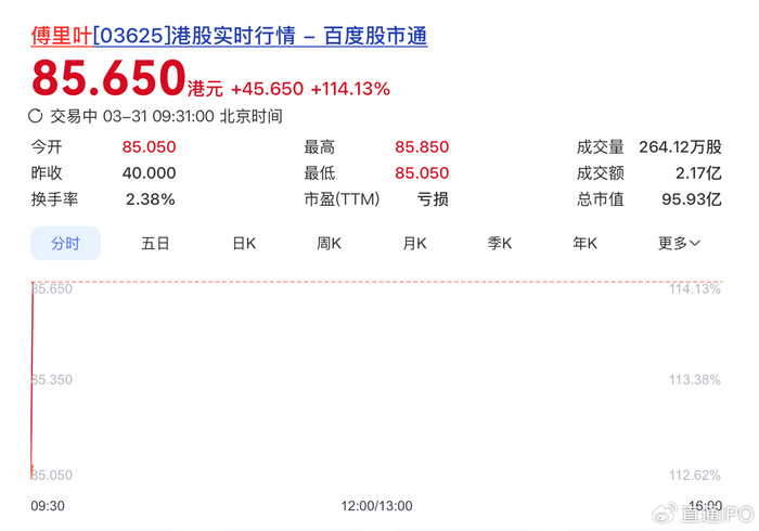 昨日暗盘交易中,傅里叶表现亮眼,最高冲至85港元,暴涨约112.5%,最终涨幅达105%报82港元。今日开盘,傅里叶高开112.62%报85.05港元,总市值95.26亿港元。