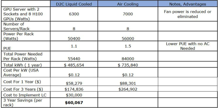 图片说明:数据中心能耗分布情况; 资料来源:NIISASupermicro曾算过这样一笔账,以此前TDP尚还不高的英伟达H100芯片测算,在采用液冷解决方案后,一方面能够使得单个GPU服务器的自身功耗从风冷的 7kW 降低至 6.3kW;另一方面,每个机架的PUE指标也将从1.5显著降低至1.1。