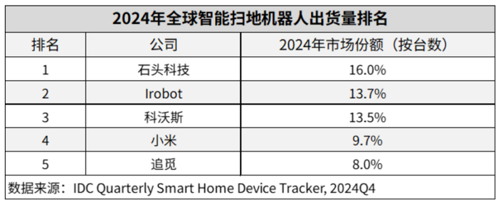 图片说明:2024年全球智能扫地机器人主要厂商市场份额,数据来源于IDC