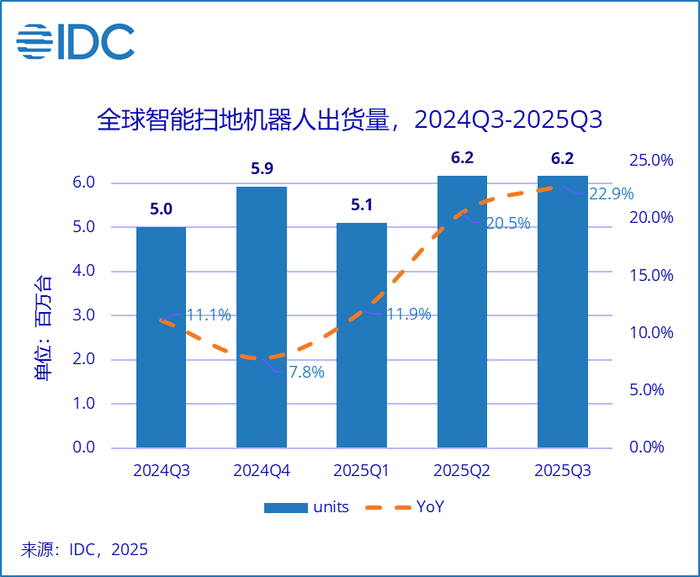 iRobot市场份额的流失,为全球竞争者创造了巨大机会。从IDC发布的2025年前三季度数据看,全球智能扫地机器人市场累计出货1742.4万台,同比增长18.7%;其中三季度出货616.1万台,同比增幅达22.9%,创近一年新高。中东非与欧洲市场成为核心增长引擎。
