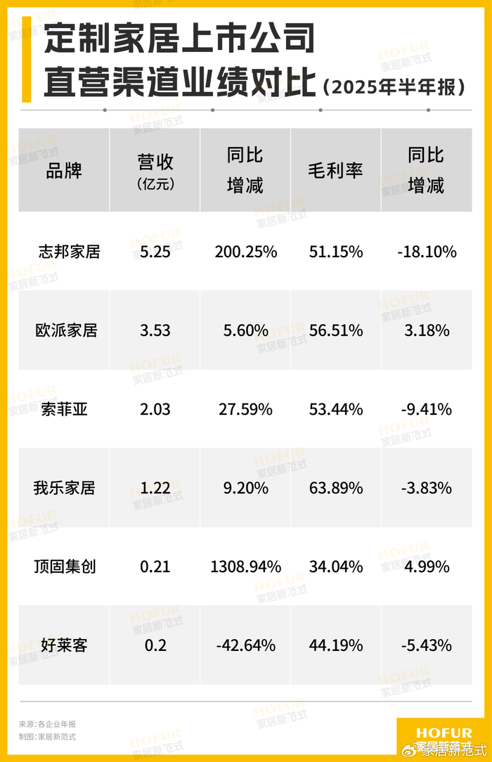 “竞对”上,同为2025年上半年,定制同行们的直营高增大多强于欧派家居,志邦总营收上更是比欧派多出近2个亿,顶固的直营业务暴增13倍+;