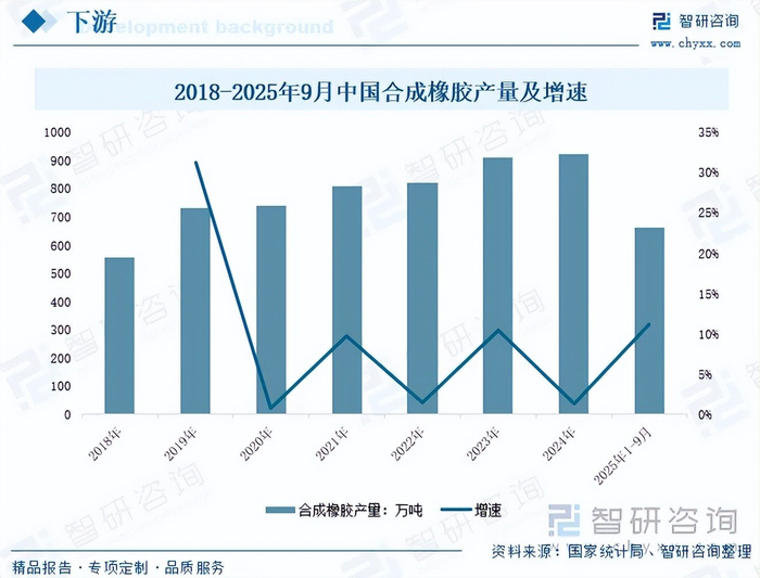 ADC发泡剂可用于合成橡胶生产,其在合成橡胶中的应用是通过受热分解产生氮气、一氧化碳、二氧化碳等气体,使橡胶材料形成多孔结构,从而提升产品的弹性和物理性能。例如,瑜伽垫、橡胶鞋底等产品的生产中常使用该技术增强弹性。近年来,在市场需求及国家政策的大力支持下,中国已成为世界第一合成橡胶生产大国,产量保持稳步上升态势。根据国家统计局数据,2018-2024年中国合成橡胶产量从559万吨增长至921.9万吨,2025年1-9月中国合成橡胶产量达到661.6万吨,同比上涨11.20%。合成橡胶产量的增加,意味着ADC发泡剂的需求量也不断上涨。