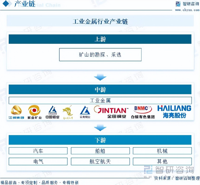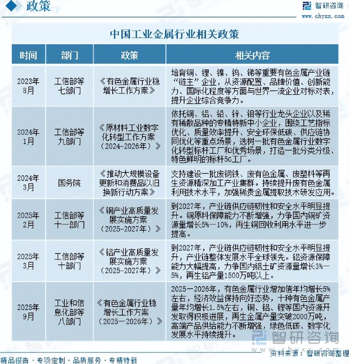 注:本文节选出自智研咨询发布的《2025年中国工业金属行业政策、产业链、产量、重点企业经营情况及趋势研判:新兴产业需求强劲,驱动工业金属创新升级[图]》行业分析文章,如需获取行业文章全部内容,可进入智研咨询官网搜索查看。