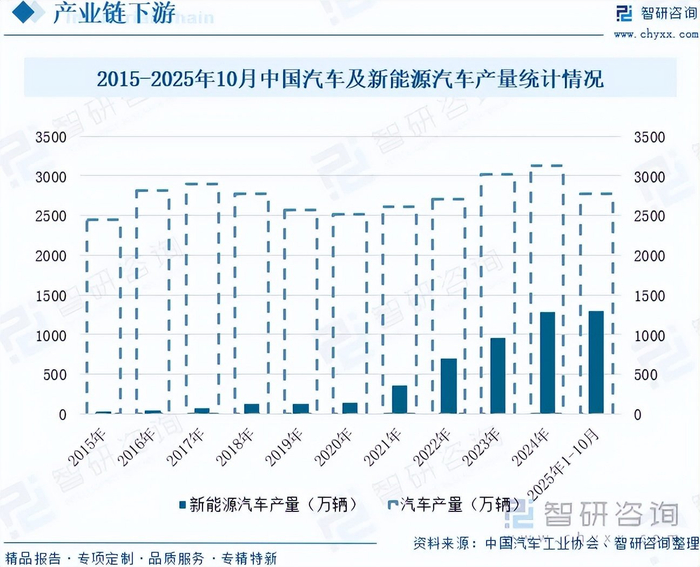 在汽车领域,工业金属被广泛用于制造车身、轮毂及车架等关键部件,是汽车制造的基础材料。近年来,政府出台一系列扶持政策,如汽车以旧换新促进政策等,地方层面也开展了灵活多样的促消费活动,对汽车消费的拉动作用非常强。与此同时,随着中国经济的快速发展,居民收入水平不断提高,对汽车的消费需求持续增长,国内市场的庞大需求为汽车产量的增长提供了广阔的空间。此外,中国汽车企业在技术创新方面不断加大投入,特别是在新能源汽车领域取得了显著突破,电池技术、智能网联功能等方面的进步,提升了中国汽车的产品竞争力,推动了汽车产量的增长。数据显示,中国汽车产量从2015年的2450.33万辆增长至2024年的3128.2万辆,年复合增长率为2.75%;新能源汽车产量从2015年的34.05万辆增长至2024年的1288.8万辆,年复合增长率为49.74%。2025年1-10月,中国汽车产量为2769.2万辆,同比增长13.2%,其中,新能源汽车产量为1301.5万辆,同比增长33.1%。未来,随着汽车产量的持续增长,将带动上游工业金属的需求稳步提升。