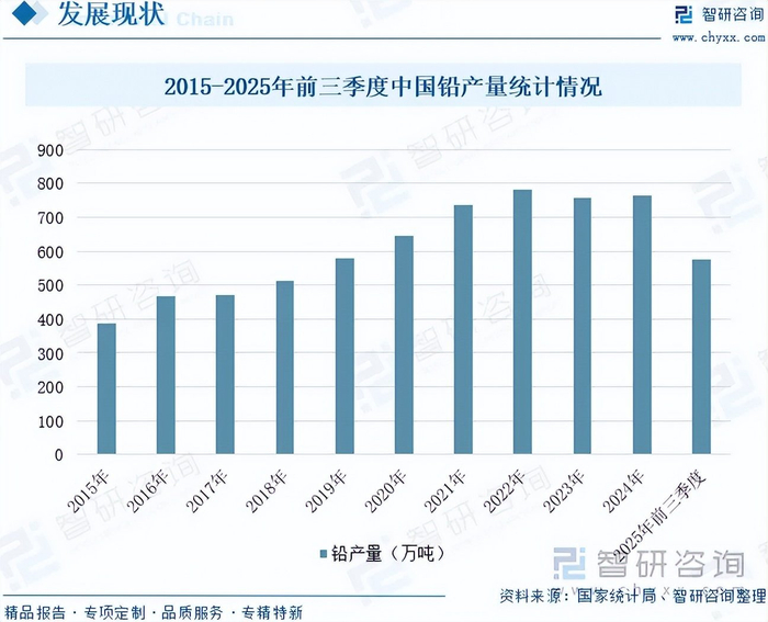 铅是一种对人体危害极大的有毒重金属,但铅具有良好的延展性、抗腐蚀性,易与其他金属制成性能优良的合金。广泛应用于蓄电池、电缆护套、机械制造业、船舶制造、轻工、氧化铅、射线防护等行业。作为工业金属之一,铅在地壳中含量仅为0.0016%。中国是全球最大的铅生产国和消费国,铅矿资源虽然丰富但分布不均,主要集中在湖南、云南、内蒙古等地。近年来,中国铅产量持续稳定增长,占全球总产量的比例较高,反映了国内铅工业的稳定发展态势。国家统计局数据显示,2015-2024年中国铅产量从385.8万吨增长至763.7万吨,年复合增长率为7.88%。2025年前三季度,中国铅产量为576.2万吨,同比小幅增长0.09%。从需求结构看,铅市场主要受蓄电池、建材、化工等行业驱动,其中铅酸蓄电池是消费主力。未来,随着新能源汽车与储能系统的快速发展,铅产量有望继续保持稳定增长。