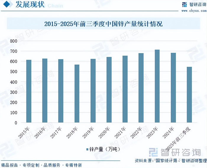 锌,是一种浅灰色的过渡金属,也是第四“常见”的金属,常温下呈固态,具有良好的导电性、导热性及优异的抗腐蚀与耐磨性能。作为现代工业中不可或缺的重要原材料,锌在电池制造领域具有不可替代的地位,同时也广泛应用于有色冶金、建材、机电、化工、汽车及军工等多个行业。此外,锌也是人体必需的微量元素之一,对生命活动起着关键作用。全球锌矿资源分布高度不均,主要集中在中国、澳大利亚、俄罗斯和秘鲁等国。截至2024年,前五大资源国的储量合计占全球近78%,其中澳大利亚占比27%,中国位居第二,占比20%。中国作为全球最重要的锌冶炼生产与消费国之一,近年来锌产量在复杂经济环境下仍表现出较强韧性,呈现波动增长态势。国家统计局数据显示,中国锌产量从2015年的615.5万吨增长至2024年的683.7万吨,年复合增长率为1.17%。2025年前三季度,中国锌产量为545.9万吨,同比增长6.68%。