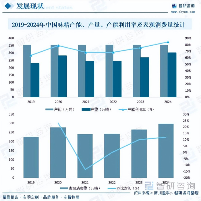 味精作为食品工业的重要部分,近年来产量保持稳定增长趋势,据百川盈孚数据显示,2024年我国味精产量达301.5万吨,同比增长11.9%,产能利用率达84.7%,与此同时,随着国民生活水平的提高,消费者对食品的口味和品质要求不断提升,味精作为一种常用的调味品,家庭与餐饮基础需求持续稳定,尤其是餐饮连锁化、预制菜、方便食品等B端场景对标准化鲜味方案需求更为旺盛,已成为味精市场的增量主力,据统计,2024年我国味精表观消费量达299.7万吨,同比增长12.0%。