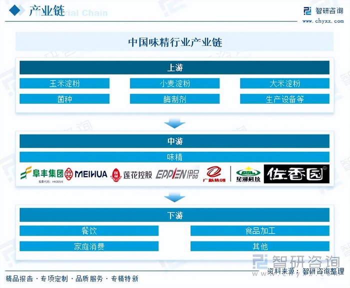 味精行业上游主要包括玉米淀粉、小麦淀粉、大米淀粉、糖蜜等原材料供应商,菌种(谷氨酸棒状杆菌等)、酶制剂(糖化酶、淀粉酶)、酸碱(氨水、硫酸等)、食盐等辅料供应商以及生产设备供应商;行业中游为味精生产企业;行业下游为消费市场,主要包括餐饮、食品加工、家庭消费等。