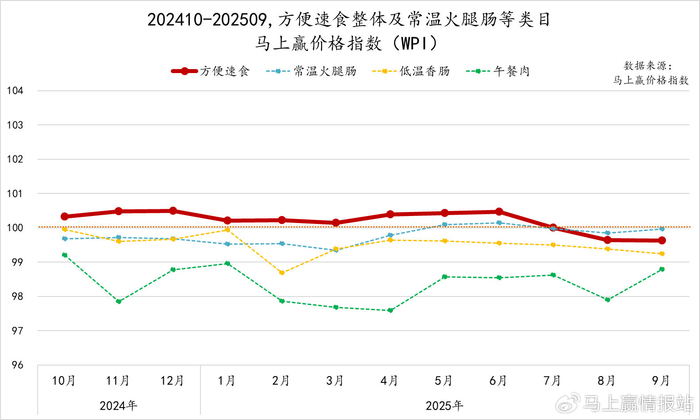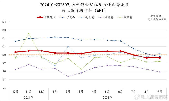 为了更好地分析方便速食类目价格的变动与走势,我们拉取了202410-202509,方便速食类目整体及各重点类目的马上赢价格指数(WPI,具体介绍参见:新产品丨马上赢价格指数(WPI)发布啦)。该指数以100为基准值,其数值上下波动为类目的价格指数与去年同期价格指数的相对百分比,100表示与去年同月持平,高于100表示同比价格水平上升,低于100则表示同比价格水平下降。