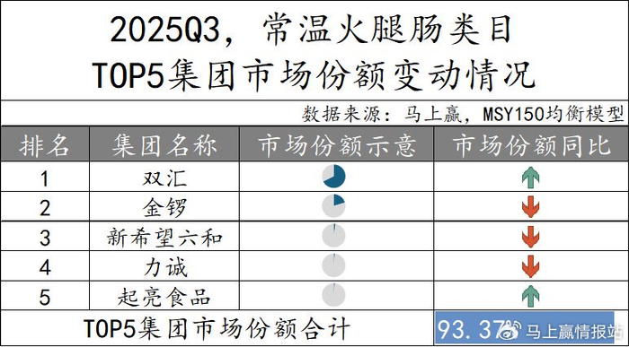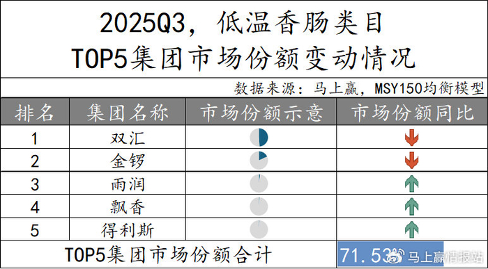 2025Q3,低温香肠类目TOP5集团分别为双汇、金锣、雨润、飘香和得利斯,市场份额合计71.53%,集中度较高但较上个季度有环比轻微下降。其中,双汇集团位居第一且占据了约50%的市场份额,但同比呈现下降;金锣位列第二,占据约15%的市场份额,同样呈现同比下降;排名第三-第五的雨润、飘香、得利斯市场份额均呈现同比提升,但市场份额都较小。