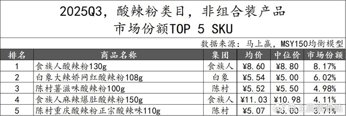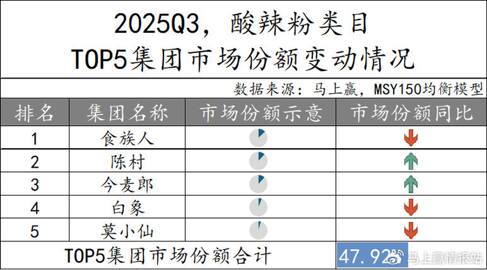 2025Q3,酸辣粉类目TOP5集团分别为食族人、陈村、今麦郎、白象和莫小仙,合计市场份额47.92%,集中度较低但环比有轻微提升。前三集团的市场份额较为接近,位列第一的食族人市场份额同比下降,而二、三位的陈村和今麦郎市场份额同比上涨。第四名、第五名的白象和莫小仙则市场份额同比下跌。