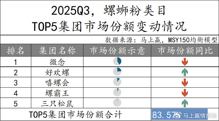 2025Q3,螺蛳粉类目的TOP5集团分别为微念、好欢螺、嘻螺会、螺霸王和三只松鼠,市场份额合计83.57%,集中度较高且较上个季度有约2%的提升。其中微念市场份额约40%,但同比下降;好欢螺则占到近1/4的市场份额,同比上升;第三、第四的嘻螺会和螺霸王市场份额也呈现同比下降,第五名的三只松鼠市场份额则同比上升。