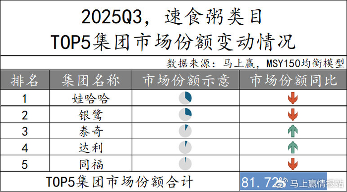 2025Q3,速食粥类目的TOP5集团分别为娃哈哈、银鹭、泰奇、达利和同福,合计市场份额81.72%,集中度较高且环比上个季度有轻微提升。其中,娃哈哈集团市场份额约40%左右,但同比呈现下跌;银鹭的市场份额约30%,同样同比呈现下跌;第三-第五的泰奇、达利与同福市场份额相对较小,其中泰奇、达利呈现市场份额同比上涨,同福则呈现同比下跌。