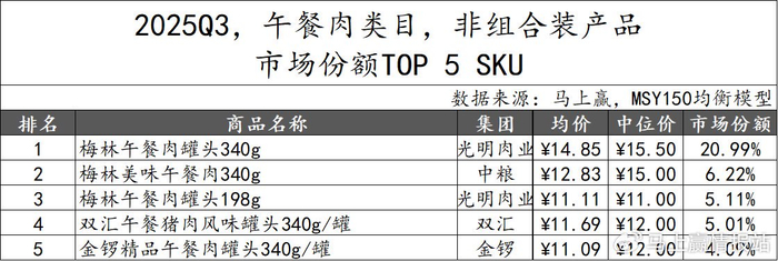 2025Q3,从午餐肉非组合装的市场份额TOP 5 SKU来看,光明肉业凭借不同规格的梅林午餐肉罐头产品位列第一和第三,其中340g规格的产品市场份额超过20%,与后续产品拉开了较大差距;中粮、双汇和金锣则分别有一款产品上榜。上榜的五款产品,件均价均位于11元~15元区间。