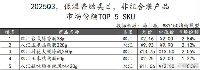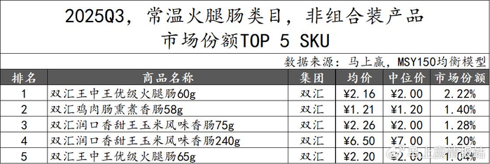 2025Q3,常温火腿肠类目非组合装产品市场份额的TOP 5 SKU均来自双汇集团,体现出其在常温火腿肠市场绝对的统治力。其中两款为王中王系列产品,分别为65g和60g,位列第一名和第五名;第二名为鸡肉肠,均价远低于TOP 5中其他产品,仅1.21元;第三名和第四名则为玉米风味的不同规格。