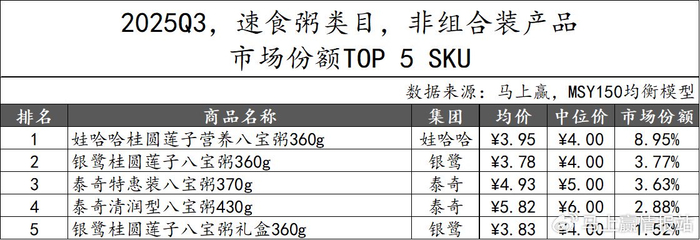 从市场份额TOP 5 SKU来看,娃哈哈的经典产品“桂圆莲子营养八宝粥360g”呈现较明显的领先地位,第二-第四则是银鹭、泰奇的相关八宝粥产品。速食粥类目TOP 5 SKU均为八宝粥产品。