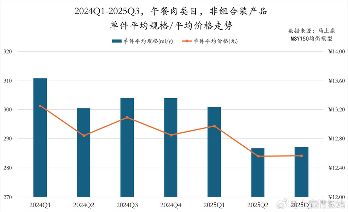 2024Q1-2025Q3,午餐肉类目非组装产品的单件平均规格和单件平均价格均呈现出下降趋势,延续类目产品形态上单片、小规格化的发展变化。其中,单件平均规格从2024Q1的310g以上逐步下滑至2025Q2已不足290g;单件平均价格也从2024Q1的13.2/件一路下降,至2025Q2已不足12.7元/件。