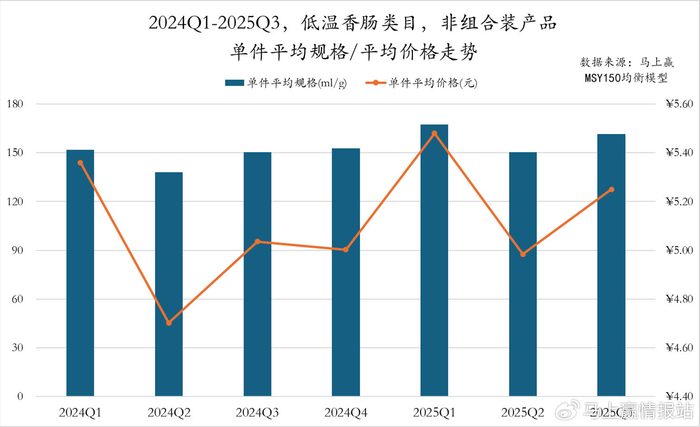 从组合装来看,常温火腿肠的单件平均规格和平均价格走势则呈现出明显的周期性变化。2024Q1与2025Q1,两个春节季度的单件平均价格均超过16元,单件平均高规格也超过540克,2024Q2则骤减。2025Q3的单件平均价格略有提升,单件平均规格相对平稳。