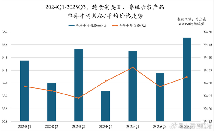 2024Q1-2025Q3,速食粥类目非组合装产品的平均规格呈现较明显的季度波动,两年的Q1、Q3均呈现高值。单价平均价格则平稳波动,2025年Q1-Q3的单件平均价格稍高于2024年各季度的平均水平。
