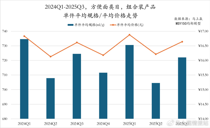 从方便面类目中的组合装产品情况来看,2024Q1至2025Q3的方便面类目单件平均价格和单件平均规格走势呈现出较为一致的趋势。整体来看,2025年的季度单件平均价格略高于2024年,但2025年的季度单件平均规格则略低于去年同期,同样显示出一定的“减量、提价”的迹象。
