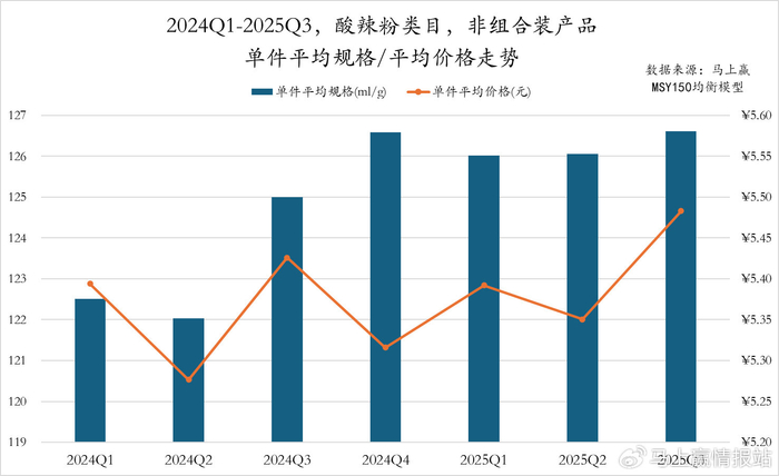2024Q1-2025Q3,酸辣粉类目非组合装产品单件平均规格有一定增长,并在2025年Q1-Q3基本保持稳定;单件平均价格上,整体有一定波动上涨的趋势。