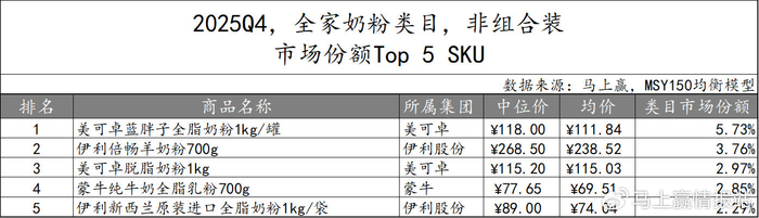 在非组合装产品中,TOP 5 SKU归属伊利股份和雀巢集团。伊利股份共有三款产品上榜,市场份额合计超20%,规格主要为700g或800g,但价格从68元-108元不等,涵盖不同功效和市场定位;雀巢集团也有两款产品位列第二和第五,其中”怡养健心中老年奶粉“主打高端路线,中位价达到133元,为TOP 5 SKU中中位价、均价最高的产品。