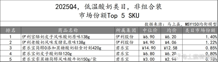 低温酸奶非组合装产品2025Q4市场份额TOP 5 SKU由伊利股份和君乐宝集团占据。伊利股份两款规格相同但风味不同的产品位居前二。君乐宝集团则主打“0添加”、“零蔗糖”概念,共有三款产品上榜。具体来看,低温酸奶非组合装TOP5产品风味多样,规格在120g-420g不等,产品类型、场景的多样性较为丰富。