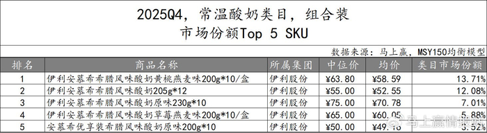 组合装产品TOP 5 SKU方面,伊利股份依旧独揽。五款头部产品均为安慕希系列,涵盖不同口味和规格,内装数量均为10个左右,五个组合装SKU的市场份额合计超过42%,显示出伊利在常温酸奶类目中的掌控力。