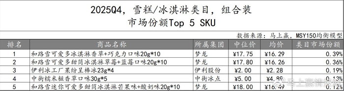 2025Q4,雪糕/冰淇淋类目非组合装市场份额TOP 5 SKU中,伊利股份有四款产品上榜,经典子品牌“巧乐兹”以不同口味和价格占据第一、第三和第四。蒙牛集团也有一款产品上榜,经典产品“随变冰淇淋经典香草口味”跻身第二。