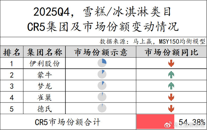 2025Q4,雪糕/冰淇淋CR5集团市场份额合计为54.38%,较上一季度有所下降,市场集中度较低。具体来看,伊利股份位居第一,但其市场份额同比有所下降,蒙牛和梦龙市场份额则同比提升,雀巢和德氏市场份额也同比有所下滑。