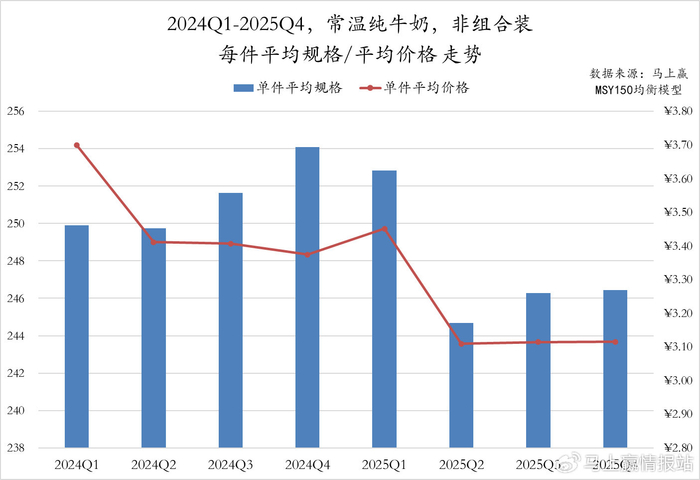 总体来看,2025Q2起,常温纯牛奶非组合装产品就呈现出了“加量不加价”的态势,背后反应的或许依然是较为激烈的竞争与较为疲软的需求。