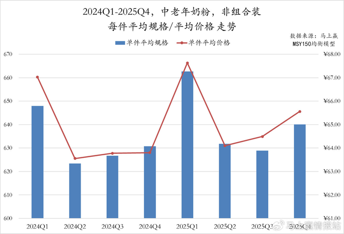 从2024Q1至2025Q4中老年奶粉非组合装产品来看,2024、2025Q1各自有一个件均规格、件均价格的高点,或与春节礼赠相关的消费有较强的相关性。从2025同比2024年的情况来看,件均价同比均有轻微上升,规格在2025Q1同比2024Q1有明显上升,其余时间有轻微上升。