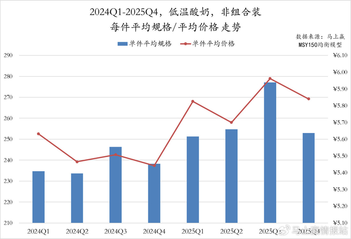 2024Q1至2025Q4,低温酸奶非组合装产品的件均规格与件均价整体呈现出波动上行后高位回调的走势。件均规格自2024Q2起波动上升,2025Q3达到最高点;件均价格走势与规格基本同步,2025Q1受春节消费拉动价格大幅攀升,虽在Q2略有回调但Q3再次拉升。总体来看,2025年前三季度规格持续走高,价格也波动提升,尽管2025Q4出现双降,但较2024年同期水平均明显提高,类目产品升级、提价或在持续进行中。