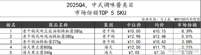 2025Q4,中式调味酱类目市场份额TOP 5 SKU中,头部集团经典产品依旧表现强势。作为市场份额第一的集团,老干妈凭借三款不同风味的辣椒酱产品占据了前三,海天则凭借两款不同规格黄豆酱产品占据第四、第五。