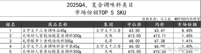复合调味料类目市场份额TOP 5 SKU中,王守义十三香经典产品”十三香调味品“以8.40%的市场份额领跑类目,此外还有升级款产品”十三香调味料金卡装“位列第四。天味集团的好人家品牌也有两款酸菜鱼调味料位列第二和第五。作为非TOP 5集团的毛哥也有一款”酸萝卜老鸭汤炖料“以独特风味跻身第三。