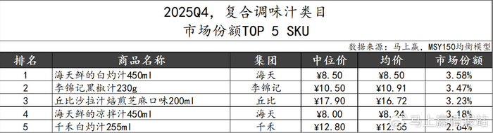 2025Q4,复合调味汁类目市场份额TOP 5 SKU归属海天、李锦记、丘比和千禾四个集团。海天以”白灼汁“和”凉拌汁“位列第一和第四;千禾同样有一款白灼汁以小规格高单价的特点位列第五。丘比以经典中高端产品“沙拉汁焙煎芝麻口味”跻身第三;李锦记也有一款”黑椒汁“位列第二,TOP 5 SKU不同的口味对应几种不同的调味汁应用场景,分别较大。