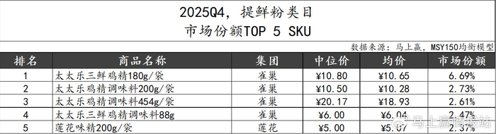 2025Q4,提鲜粉类目市场份额TOP 5 SKU中,雀巢集团包揽前四席,均为“太太乐”品牌鸡精,规格从88g-454g不等。莲花集团则凭借一款味精跻身第五。整体来看,提鲜粉类目中的TOP SKU仍由鸡精、味精主导,松茸鲜类型产品尽管是近一两年调味品市场中的“新星概念”,但在实际的份额竞争中仍未形成明显优势。