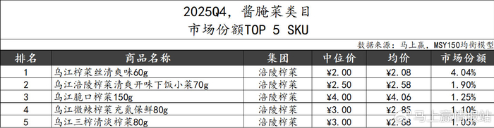 2025Q4,酱腌菜类目市场份额TOP 5 SKU中,头部集团涪陵榨菜依旧包揽所有席位,规格从60g-150g不等,包含”清爽“、”微辣“、”清淡“等不同口味,满足不同消费需求。