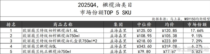 2025Q4橄榄油类目市场份额TOP 5 SKU由益海嘉里集团旗下的欧丽薇兰品牌包揽,TOP 5 SKU的市场份额合计就已经接近50%。TOP 5 SKU涵盖了从79-343元/pcs,规格从750ml-5L的各种不同类型的产品,从侧面体现了欧丽薇兰橄榄油系列产品较为成熟、系统的矩阵和产品布局。