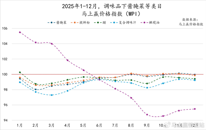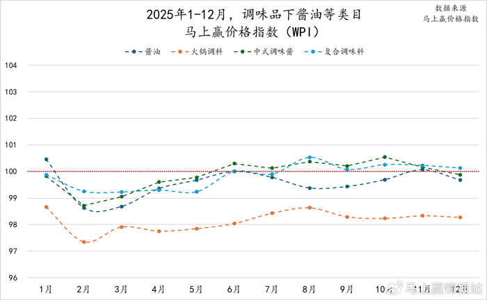为了更好地分析类目价格的变动与走势,我们拉取了2025年全年分月,调味品类目整体及各重点类目的马上赢价格指数。马上赢价格指数(WPI)以100为基准值,其数值上下波动为类目的价格指数与去年同期价格指数的相对百分比,100表示与去年同月持平,高于100表示同比价格水平上升,低于100则表示同比价格水平下降。