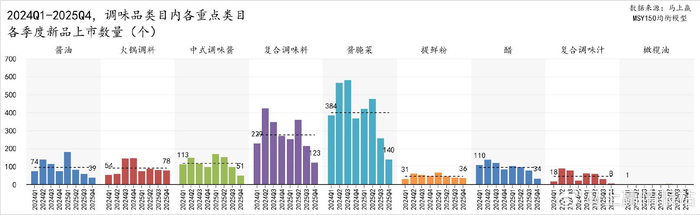 中式调味酱和醋处于第二梯队,两个类目2025年相比2024年上新数量亦有萎缩。中式调味酱新品上市数量维持在100左右,2025Q4缩减明显;醋类目新品上市数量略少于中式调味酱,上新节奏相对稳定。