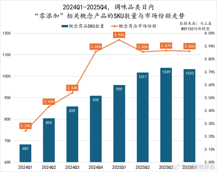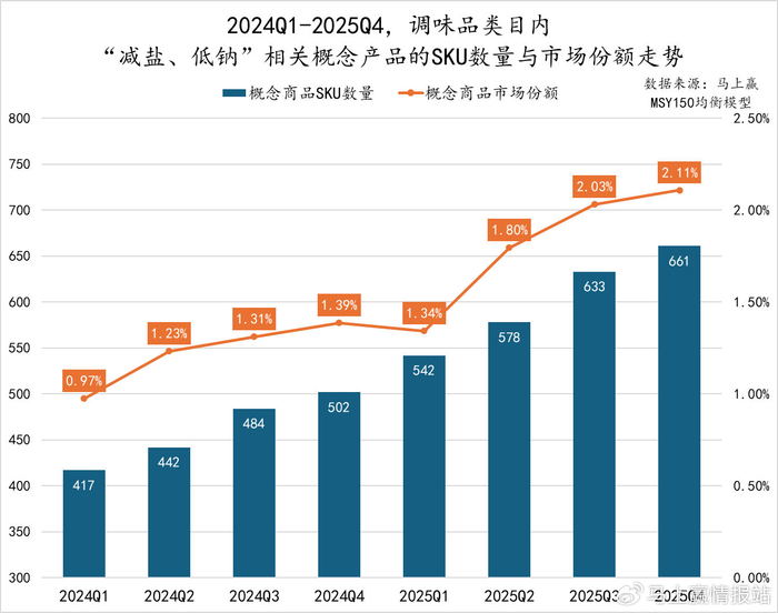 2024Q1至2025Q4,“减盐、低钠”相关概念产品SKU数量稳步增长,从417个持续扩张至661个,概念正在被越来越多的品牌与消费者接受和认可;SKU数量供给不断攀升的背景下,概念市场份额从2025Q1起增速显著提升。从发展趋势上看,该概念也或将在未来持续吸收转化零添加概念的相关消费人群。
