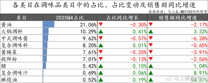 在本季度,我们选取了酱油、火锅调料、中式调味酱、复合调味料、酱腌菜、提鲜粉、醋、复合调味汁、橄榄油共9个较有典型性与代表性的类目进行增速与类目内情况的观察,以2025Q4重点类目的市场份额计算,上述9个类目的市场份额合计>70%。